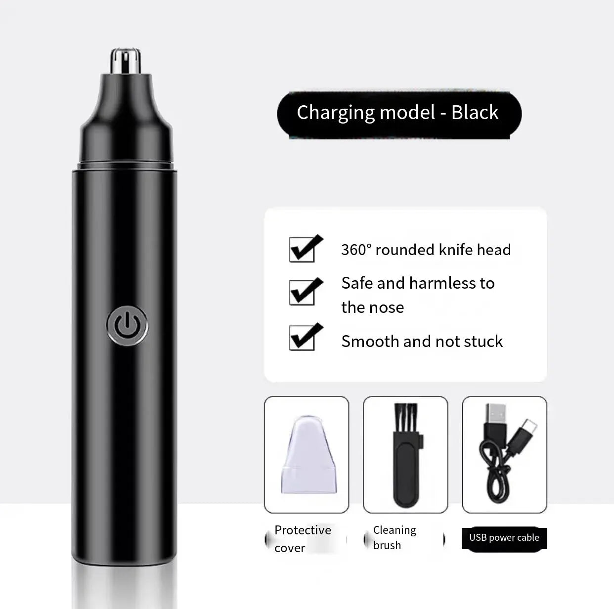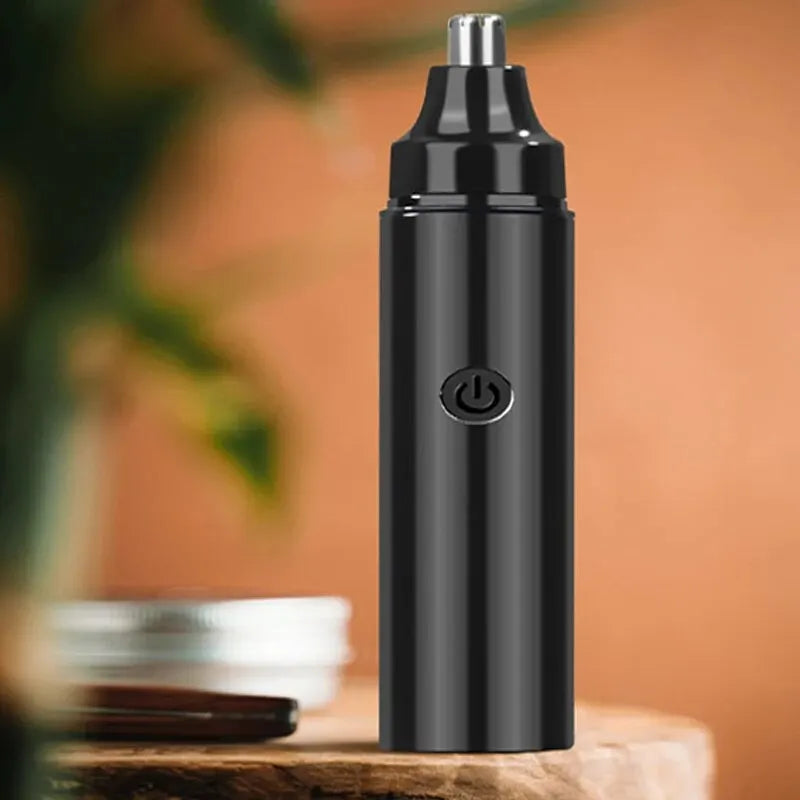 Compact nose/ear hair trimmer with a high-torque motor for quick, low-noise grooming. Stainless dual-edge blade, rinse-clean head, and protective cap.